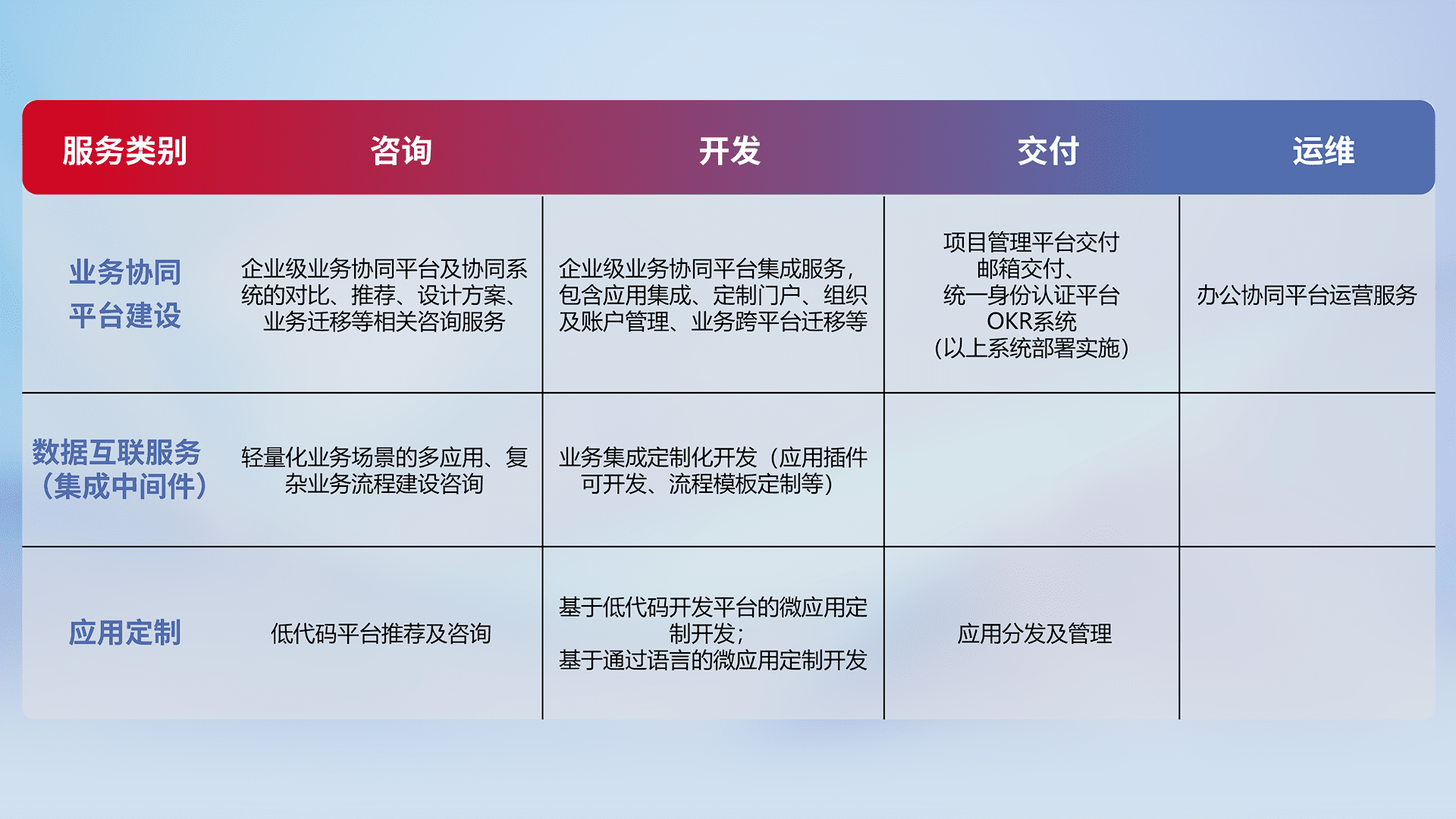 针对钉钉、、企微、、、、IDaas等平台级产品提供产品的规划、、、方案、、、交付、、、定制化开发等服务,,实现如统一协同办公、、、智能客户服务、、混合会议管理、、、、智能数据查询、、、、等业务场景,,,,实现数字化转型。。。。