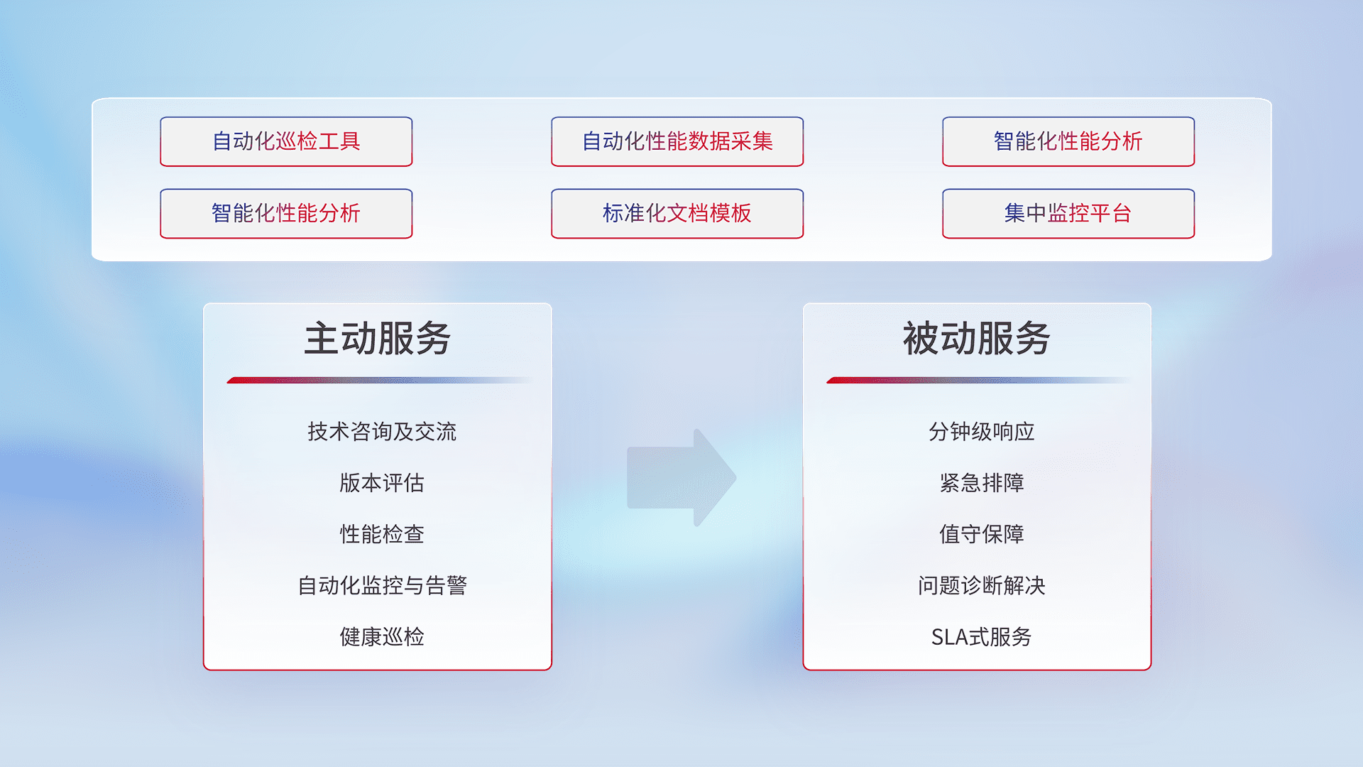智能化工具和标准化文档,,保障服务质量,,,提供主动服务(包含技术咨询、、版本评估、、性能检查、、自动化监控与告警、、、、健康巡检)和被动服务包含(分钟级响应、、、紧急排障、、、值守保障、、问题诊断解决、、、、SLA服务)。。